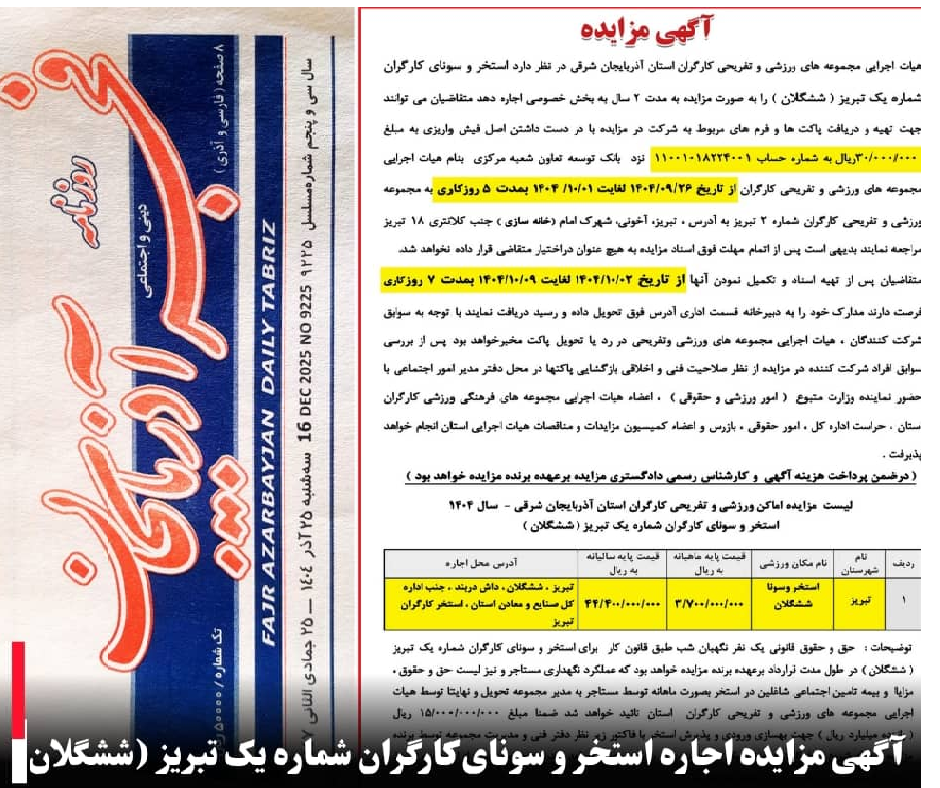 هیات اجرایی مجموعههای ورزشی و تفریحی کارگران استان آذربایجان شرقی، در نظر دارد استخر و سونای کارگران شماره یک تبریز (ششگلان) را از طریق مزایده عمومی و به مدت دو سال به بخش خصوصی واجد شرایط اجاره دهد.