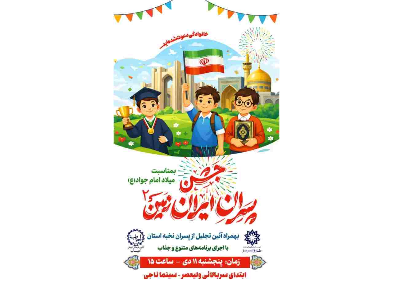 به گزارش آدینه پرس، «پسران ایران زمین» عنوان جشنی است که برای دومین سال پیاپی بمناسبت روز پسر و همزمان با سالروز ولادت حضرت جوادالائمه (ع) در تبریز برگزار خواهد شد.