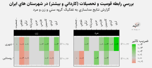 مقایسه توزیع جمعیت تحصیلکرده به تفکیک گروه سنی در شهر و روستا و بین زن و مرد حاوی نتایج مهمی است. در جمعیتِ مسنتر درصد مردان تحصیلکرده از درصد زنان تحصیلکرده تقریبا در تمامی مقاطع تحصیلی بیشتر است. اما هر چه نگاهمان را از گروههای مسنتر به سمت گروههای جوانتر معطوف کنیم این تفاوت کمتر میشود و توزیعِ درصدِ جمعیت تحصیلکرده مردان و زنان به یکدیگر نزدیک میشود. کاهش اختلاف تحصیلات زن و مرد در میان گروههای سِنّی جوانتر در میان زنان شهری با مدرک کارشناسی تا آنجا پیش میرود که درصد ایشان در شهرستانهای کشور در بازه سنی ۲۰ تا ۴۰ سال به طور میانگین از مردان پیشی میگیرد.