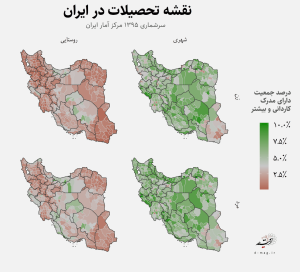 بررسی دادههای سرشماری مرکز آمار ایران در سال ۱۳۹۵ نشان میدهد که آخرین مدرک تحصیلی در میان زنان و مردان شهری و روستایی در شهرستانهای کشور تفاوتهای سیستماتیکی دارد. به عنوان نمونه میزان تحصیلات در جمعیت شهری چه در میان زنان و چه در میان مردان از مقدار معادل آن در جمعیت روستایی بیشتر است. مثلا در شهرستان خوانسار، در میان زنان شهری بیش از ۹% از جمعیت مدرک تحصیلی کارشناسی دارند اما این مقدار در میان زنان روستایی کمتر از ۳% است. مقایسه توزیع درصد جمعیت تحصیلکردۀ شهرستانهای ایران بین شهر و روستا و زن و مرد به خوبی این تفاوتها را آشکار میکند.